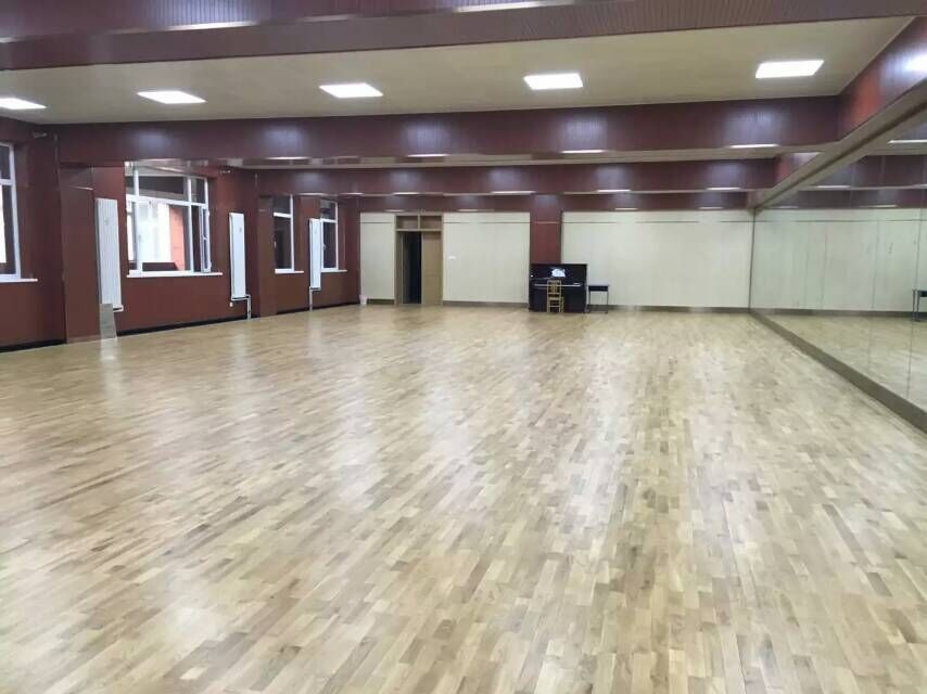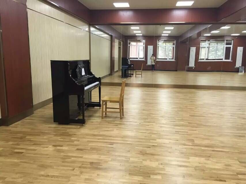 舞蹈房木地板采用柞木實木運動地板,單層龍骨減震結構。柞木地板質地堅硬,表面油漆系數(shù)滿足學生舞蹈運動要求,又能上一些大型的道具而不損害地板。