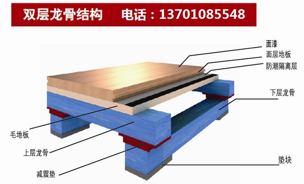 運(yùn)動(dòng)木地板面層地板材質(zhì)精選我國(guó)東北優(yōu)質(zhì)楓木、柞木,地板規(guī)格:厚18-22mm*寬60-120mm*長(zhǎng)1800mm。毛地板為高壓多層膠合板,滿鋪于龍骨上,可以有效抗變形及提高穩(wěn)定性,平整穩(wěn)固,能有效控制變形。龍骨采用加拿大進(jìn)口松木,并且經(jīng)過(guò)防腐防火處理。歐氏氏紅色源生橡膠彈力減震墊則是****產(chǎn)品,減震效果好,使用壽命長(zhǎng),運(yùn)動(dòng)性能更佳。